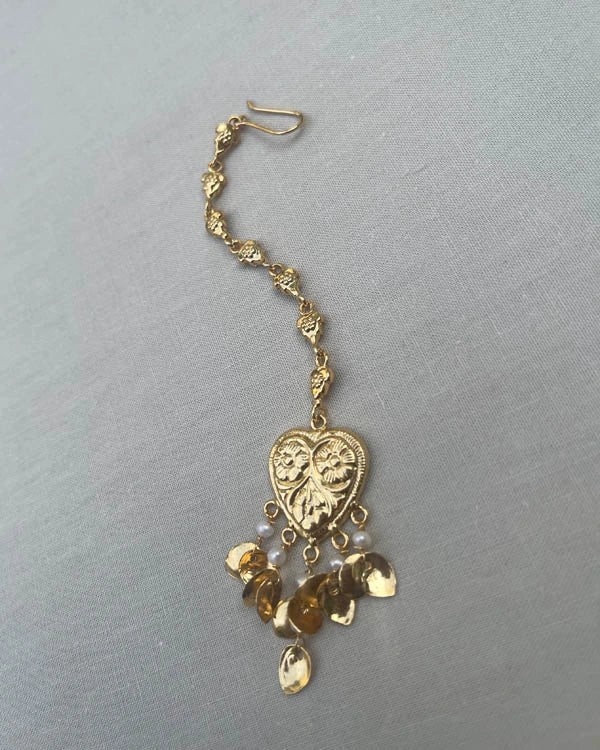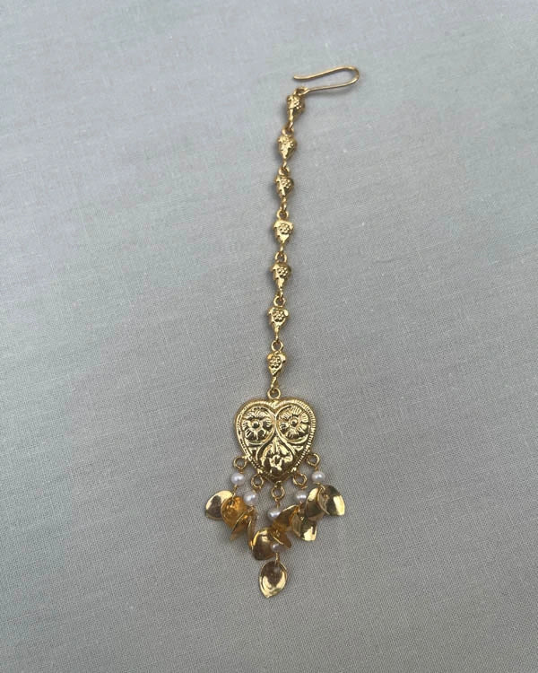 The Begum tikka is made by cutting, shaping, and joining copper petals, held together with a real basra pearls. It features a heart-shaped top and a 4-inch chain made with tiny die cut pieces.
