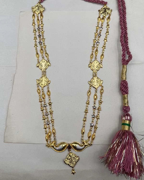 The Twin Flame Maala is adorned with delicate star details and finished with a thread dori closure. The fish motifs are crafted using a stamping technique, while the stars are carefully die-cut by hand. Designed in a refined dual tone, the piece features a gold-plated base highlighted with silver (rhodium) accents.